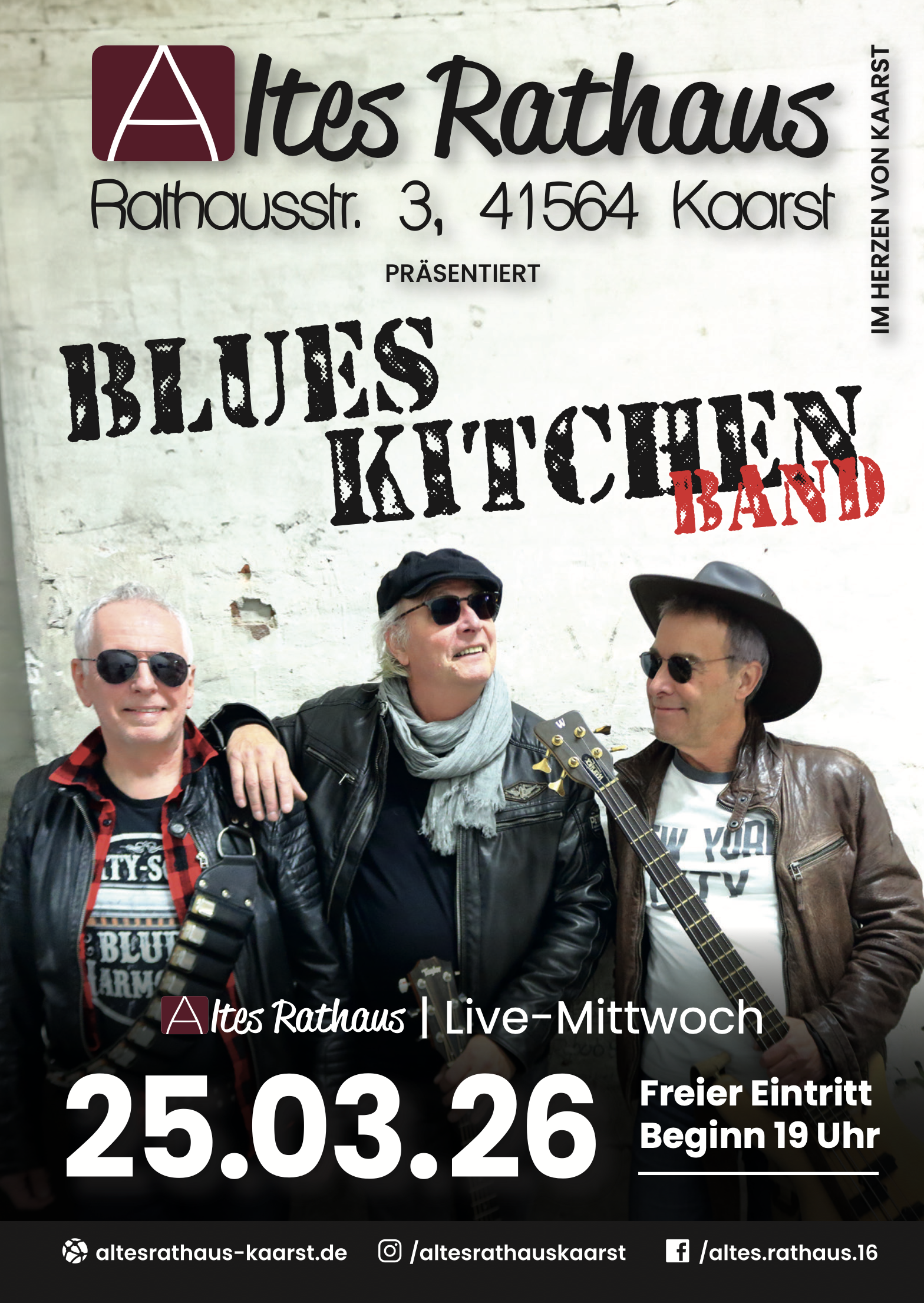 Altes Rathaus Kaarst Rathausstr. 3, KaarstLive-Musik Donnerstag im Herzen von Kaarst! Am Mittwoch, 25. März ist es wieder so weit – die grandiose Liveband "BLUES KITCHEN" rockt das Alte Rathaus Kaarst! Ein Muss für alle Musikliebhaber! Wo? Altes Rathaus, Kaarst Wann? 19:00 Uhr Eintritt? Frei! Kommt vorbei, genießt die Atmosphäre und erlebt handgemachte Live-Musik mitten […]