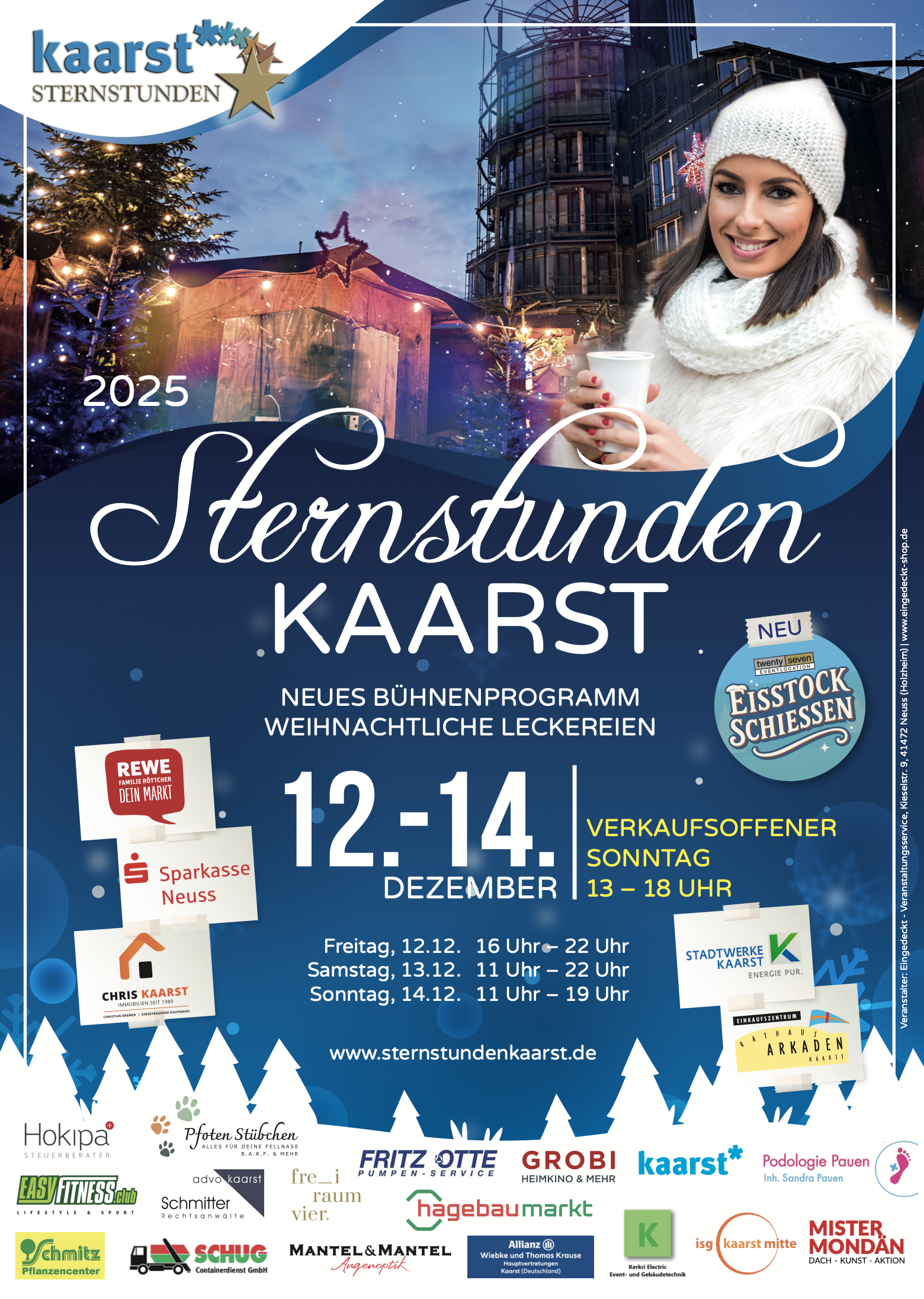 ✨ Sternstunden Kaarst 2025 – Wir sehen uns vom 12.–14. Dezember! ✨ Die Kaarster Innenstadt verwandelt sich auch dieses Jahr wieder in ein funkelndes Winterwunderland!Freut euch auf ein neues Bühnenprogramm, weihnachtliche Leckereien, gemütliche Hütten, stimmungsvolle Musik und viele kleine Highlights, die euch in Weihnachtslaune bringen. 🎄 Eisstockschießen – neu in […]